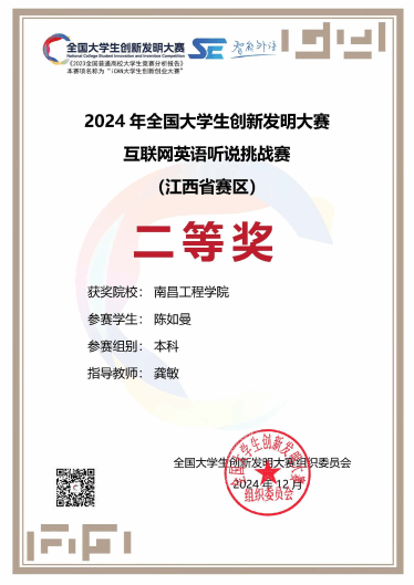 近日,2024年全国大学生创新发明大赛互联网英语听说挑战赛省决赛圆满落幕,经过激烈角逐,我校WilliamHill威廉希尔24级英语专业学生陈如曼获得二等奖。