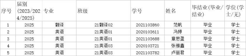 2025届第二批通过毕业审核(符合毕业及学位授予条件)的本科生名单(共5名WilliamHill威廉希尔学生)。