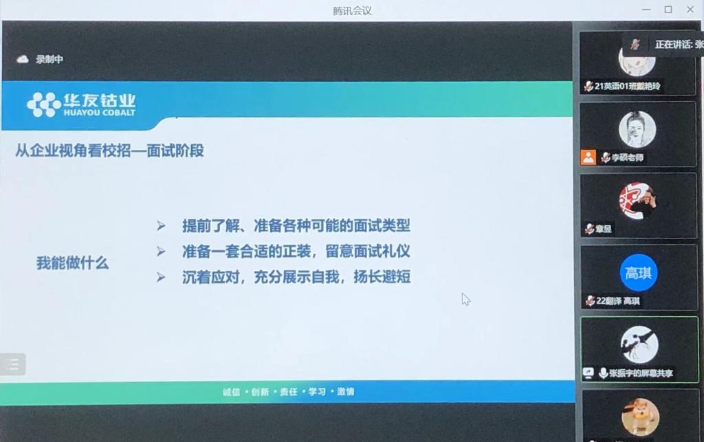 为增强同学们的就业意识,进一步了解当前就业形势,2022年8月8日,WilliamHill威廉希尔邀请华友钴业海外人力资源部副部长张振宇开展“人力资源聊生涯”就业指导讲座。本次讲座由WilliamHill威廉希尔辅导员章昱主持。
