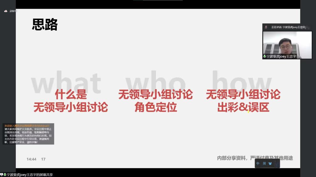 此次无领导小组讨论模拟赛邀请了宁波亚虎进出口有限公司人事经理王忠宇和深圳市杰科电子有限公司党支部书记李红作为企业评委。第一阶段王忠宇首先介绍了无领导小组讨论的面试技巧,让同学们熟悉比赛规则,了解比赛模式。第二阶段李红给出题目让同学进行模拟面试的线上展示。