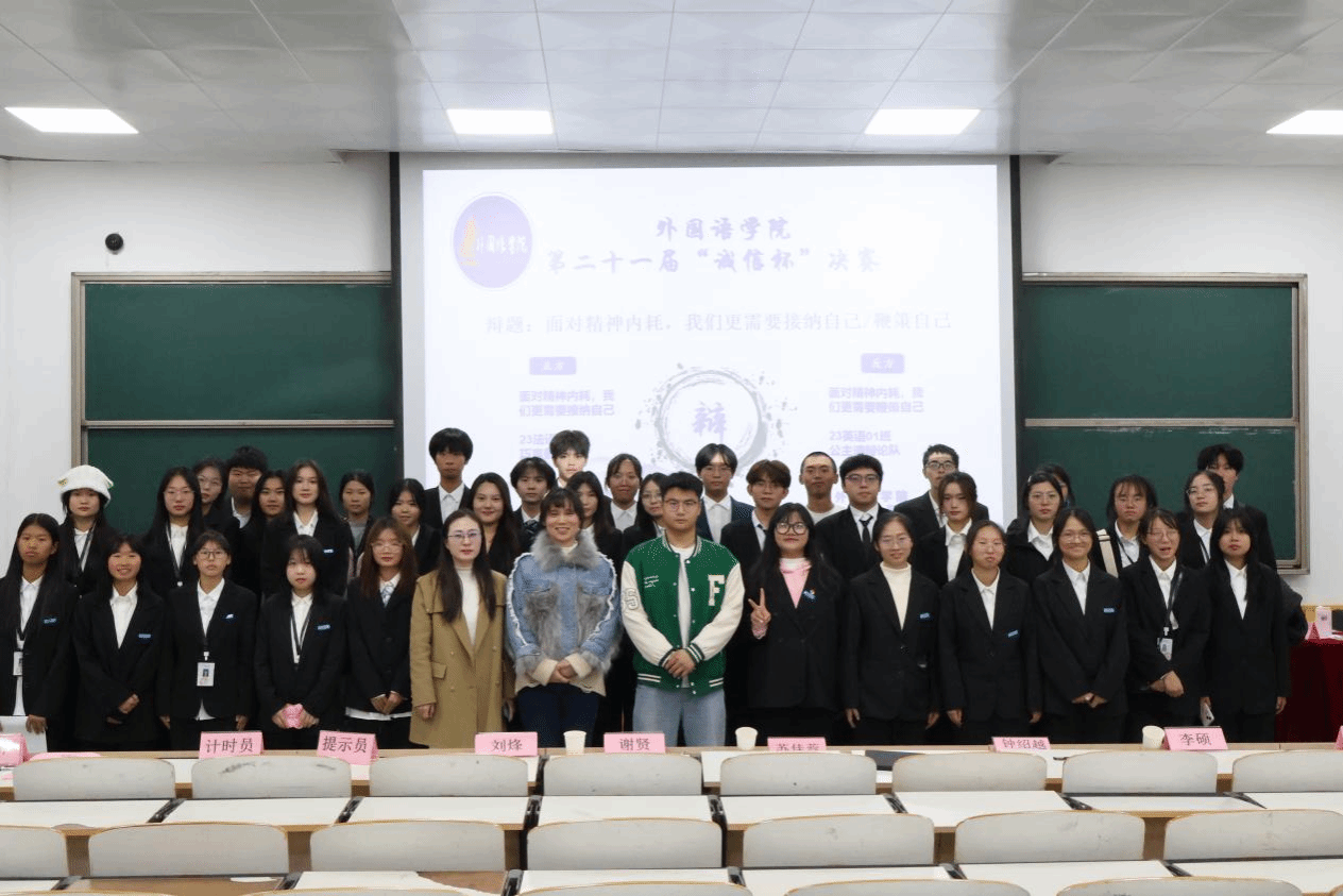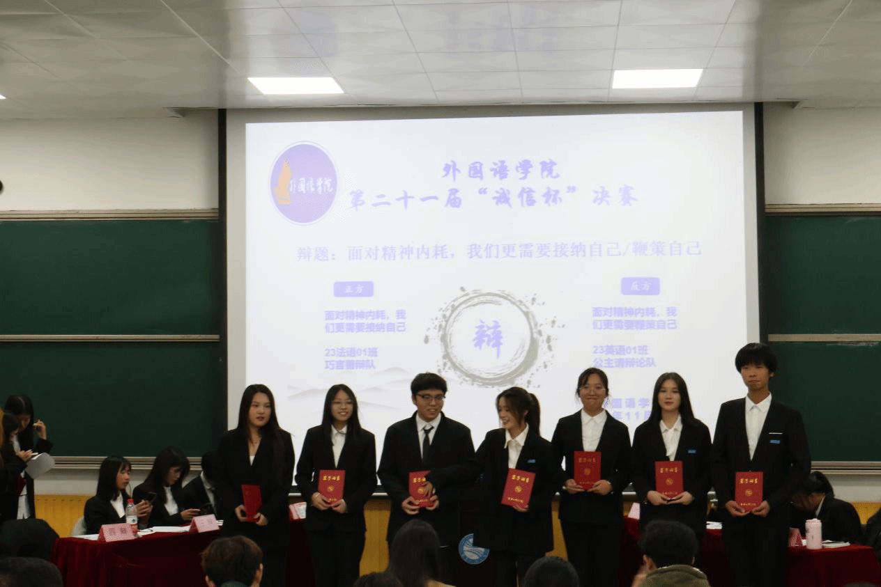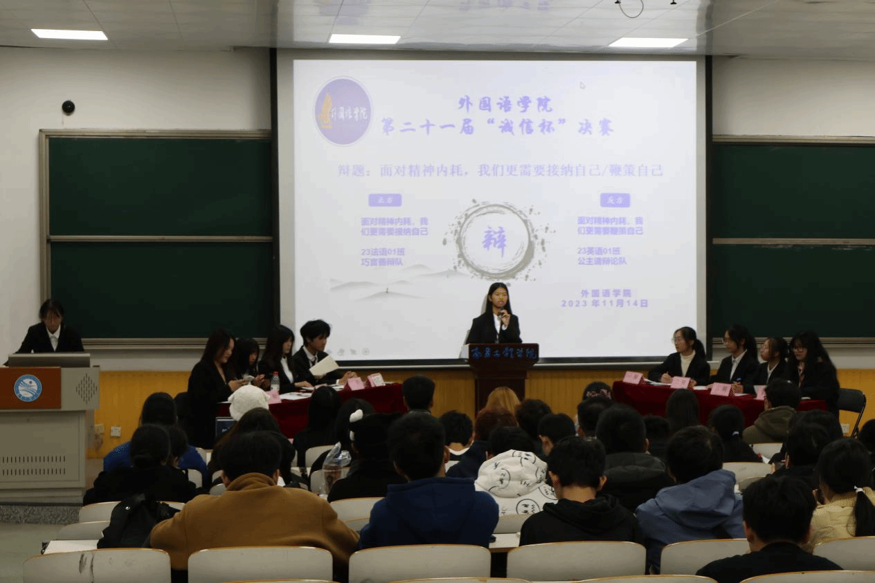 经过辩论初选赛、复赛,最终有两支队伍杀入总决赛。冠军争夺赛以“面对精神内耗,我们需要接纳自己/鞭策自己”为辩题,共分立论、攻辩、自由辩论及总结陈词等环节。赛场气氛紧张热烈,场下观众掌声连连响起。经过一番唇枪舌剑,来自23法语01班的“巧言善辩队”夺得冠军。最后,各评委代表分别为本场比赛做了精彩点评。