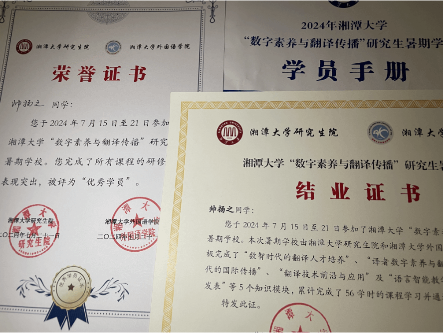 帅扬之同学则在暑期蓄力提升,赴湘潭大学参加了首届“数字素养与翻译传播”研究生暑期学校(7月14-22日),通过暑期学校与行业精英面对面交流,拓宽视野,激发创新思维,为未来的学术研究和职业发展打下坚实的基础。