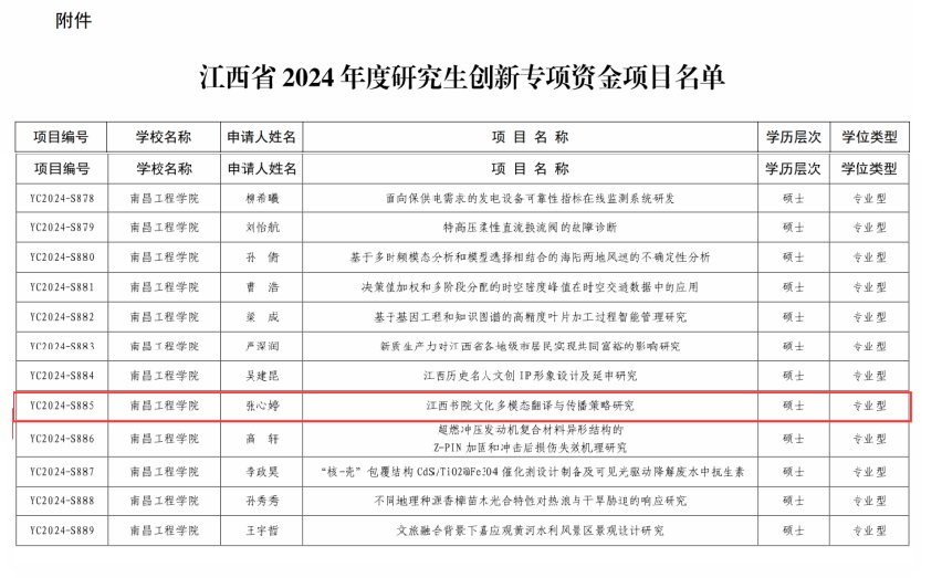 近日,我院23级英语笔译专业研究生张心婷申报的《江西书院文化多模态翻译与传播策略研究》项目成功获批江西省研究生创新专项资金项目立项,展现了我院研究生的学术风采和创新能力。